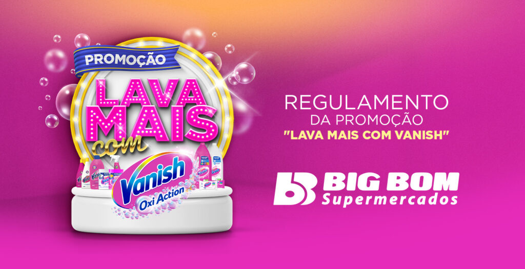 A promoção “Lava Mais Com Vanish” é uma iniciativa exclusiva da empresa proponente SUPERMERCADO BIG BOM LTDA., inscrita no CNPJ/MF sob o nº 50.582.170/0001-08, com sede na Av. Bandeirantes n. 1521, Parque Cidade Nova, na cidade de Mogi Guaçu, Estado de São Paulo, CEP 13.845-440, de agora em diante denominada simplesmente BIG BOM, válida para suas unidades de Mogi Guaçu e São João da Boa Vista, no Estado de São Paulo, que visa fomentar as vendas nos referidos estabelecimentos, cuja consecução é disciplinada pelo presente regulamento. Certificado de Autorização SPA/ME Nº 06.044979/2025.