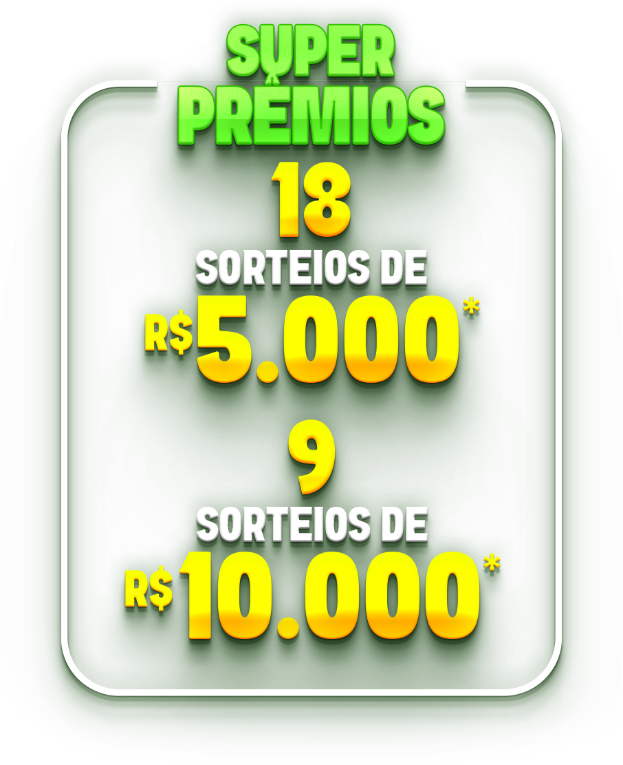Serão 9 sorteios diários de vales-compra de R$200, além dos sorteios finais de vales-compra de R$1.000 e dos grandes prêmios em PIX: 9 sorteios de R$10.000 e 3 sorteios de R$30.000!