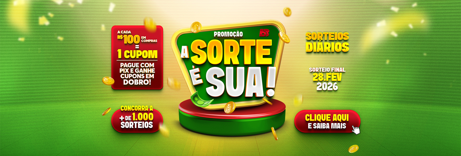 São mais de 1.000 sorteios esperando por você! A cada R$100 em compras, você ganha 1 cupom para participar e se pagar com PIX, ganha cupons em dobro!